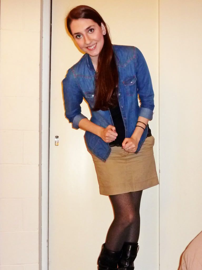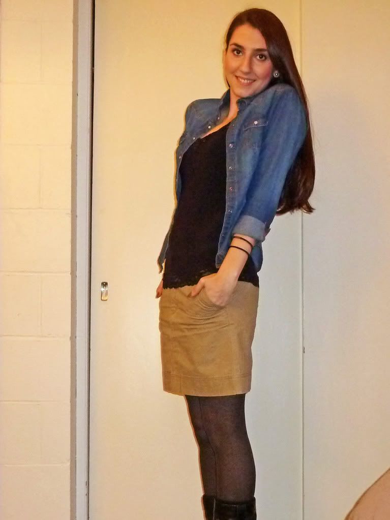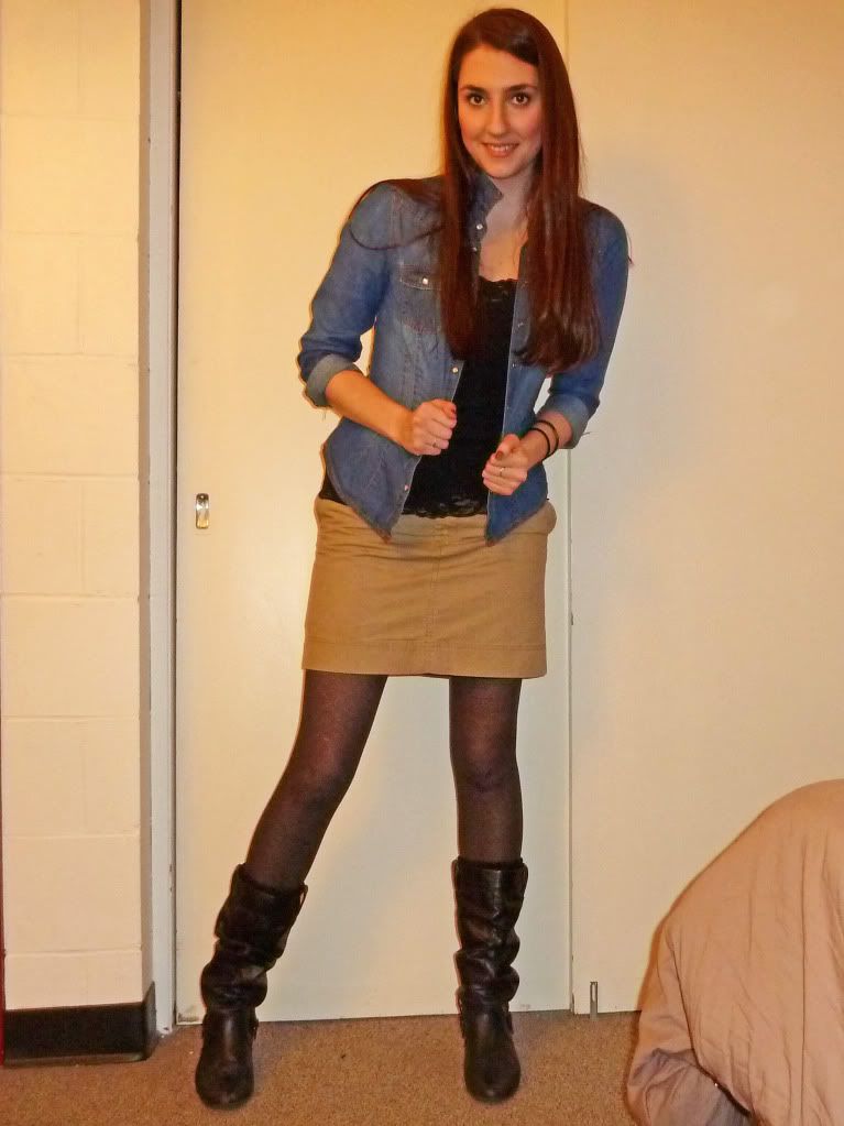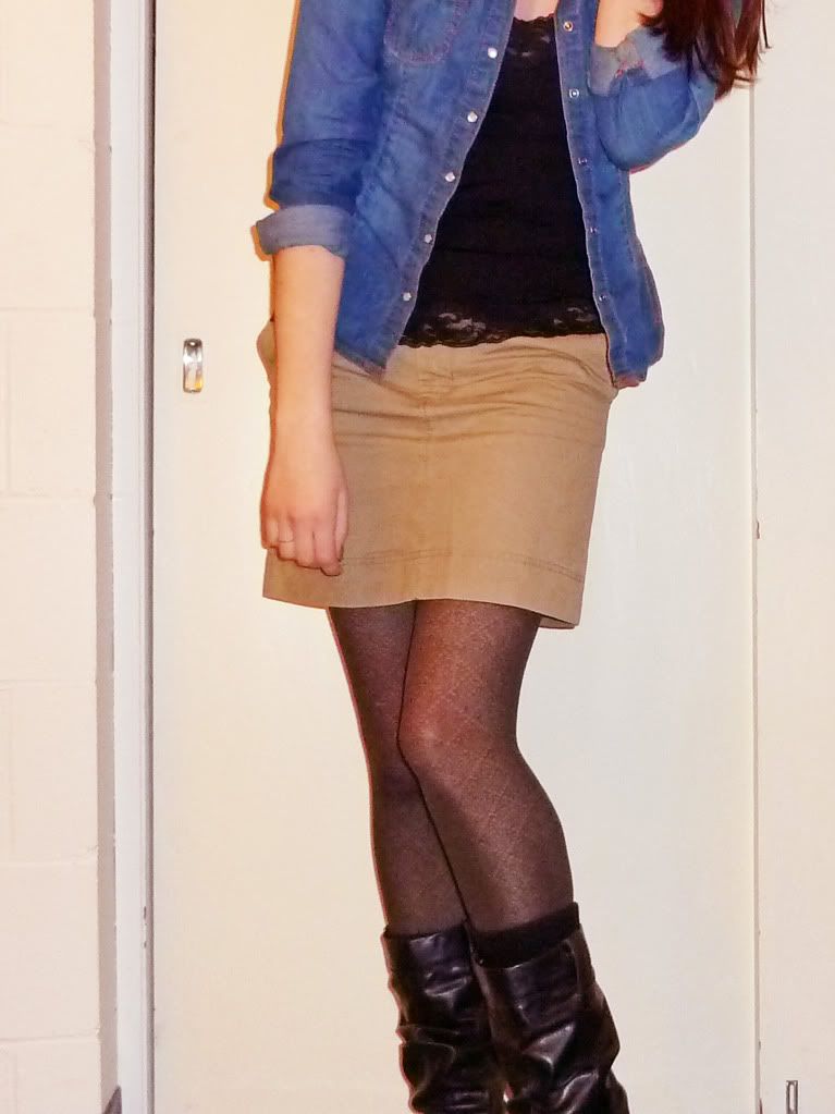 {Denim Button-Up: H&M, Cami: unknown, Skirt and Tights: Gap, Boots: Roberto Vianni}