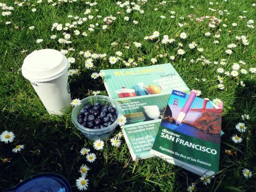 I went to the park and spent a few hours snacking on the first blueberries of the year and reading my new travel book on San Francisco. Yeah, that's right. San Fran.