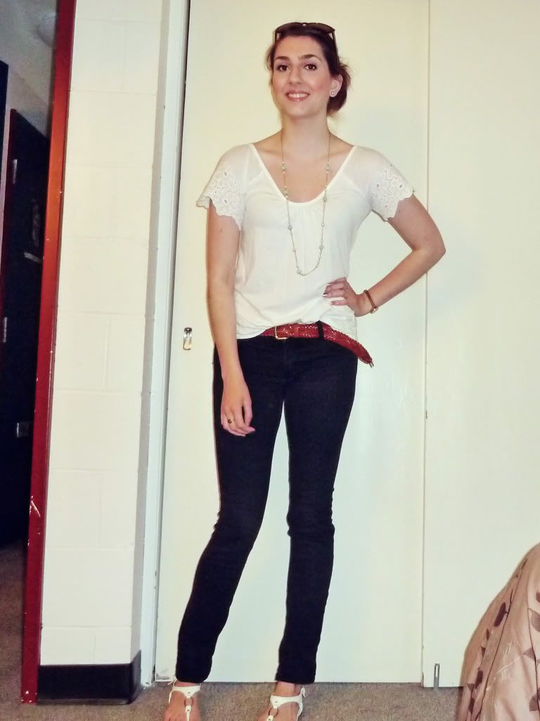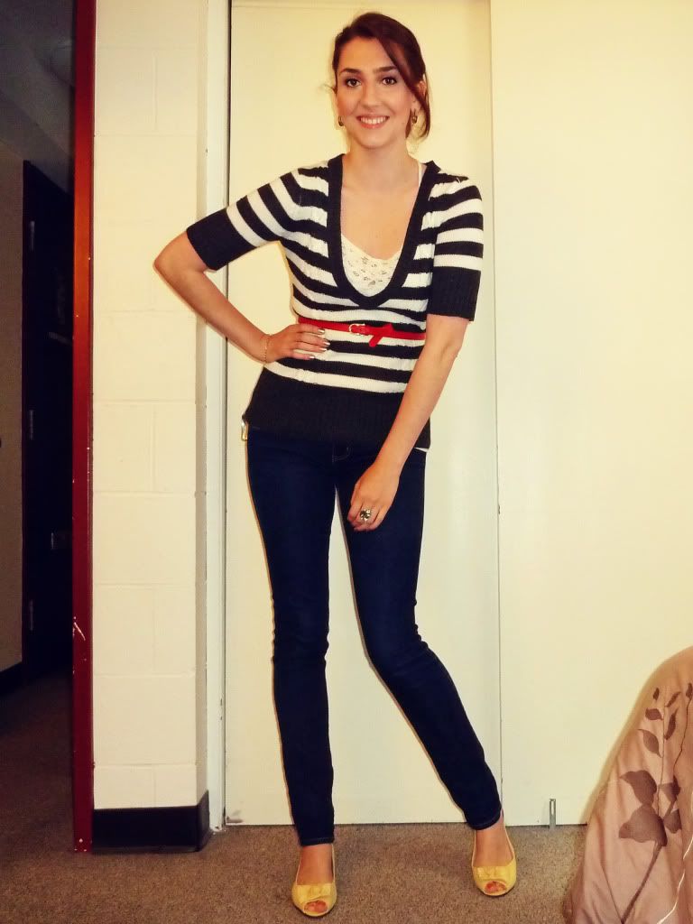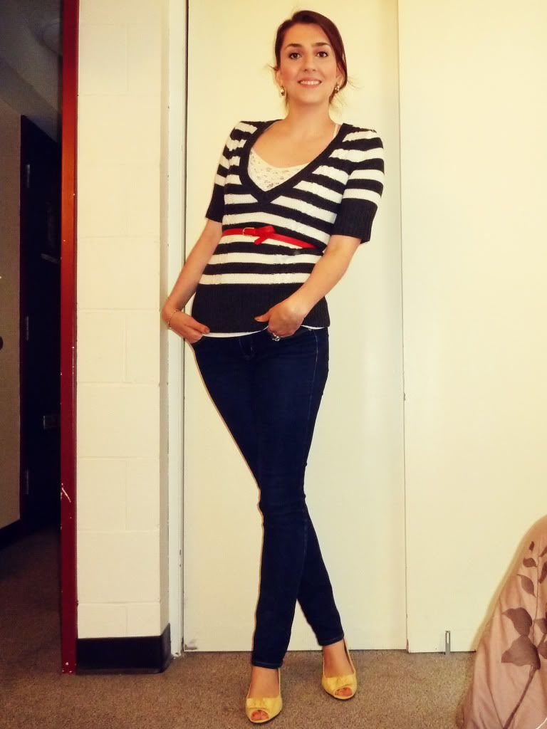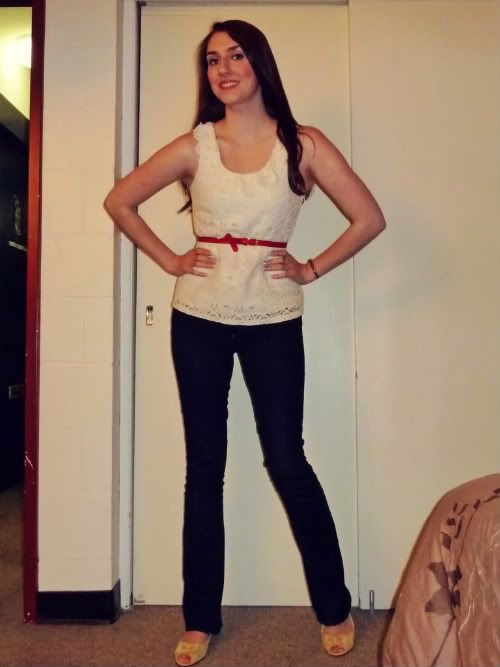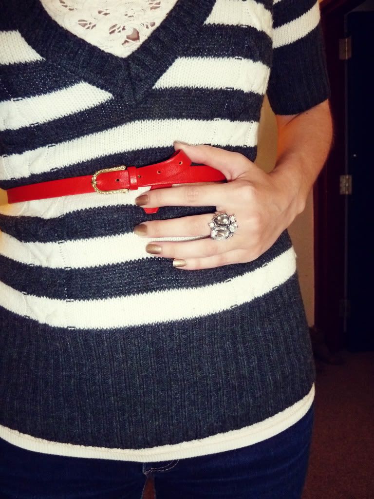 {Cami: Garage, Sweater: Old Navy, Jeans: American Eagle, Belt: Vintage, Shoes: Payless, Ring: RW&Co., Nail Color: OPI Glitzerland}