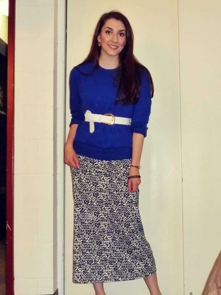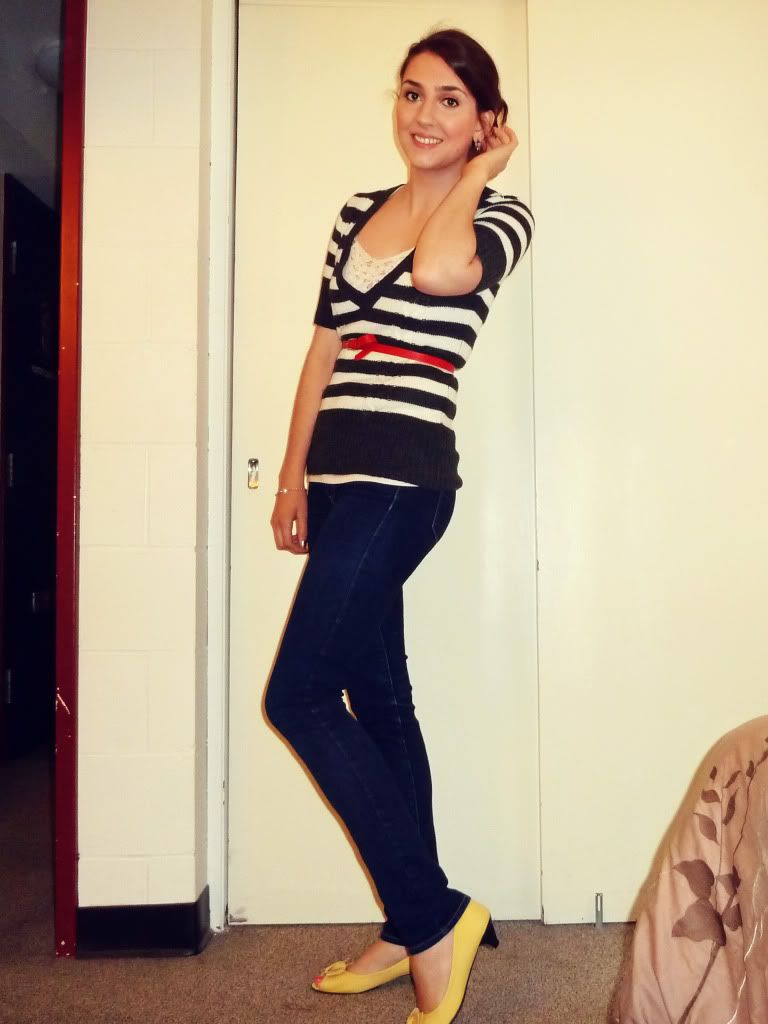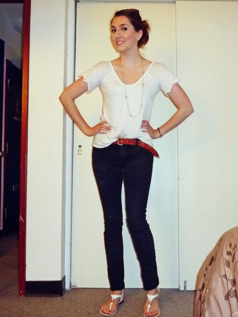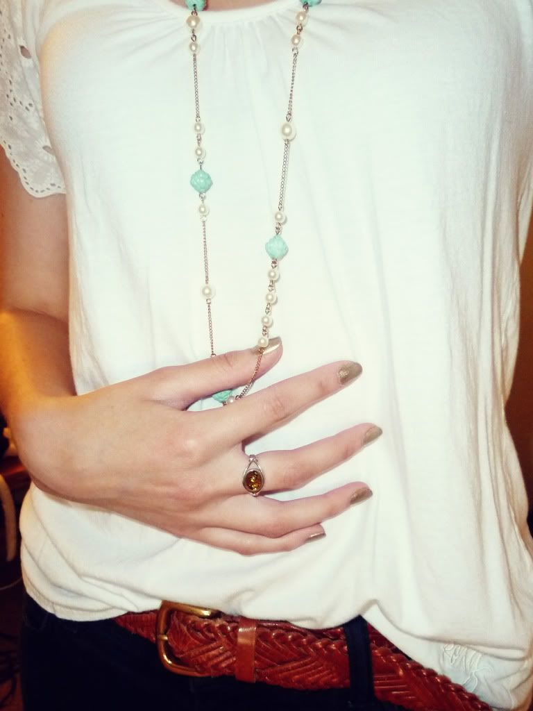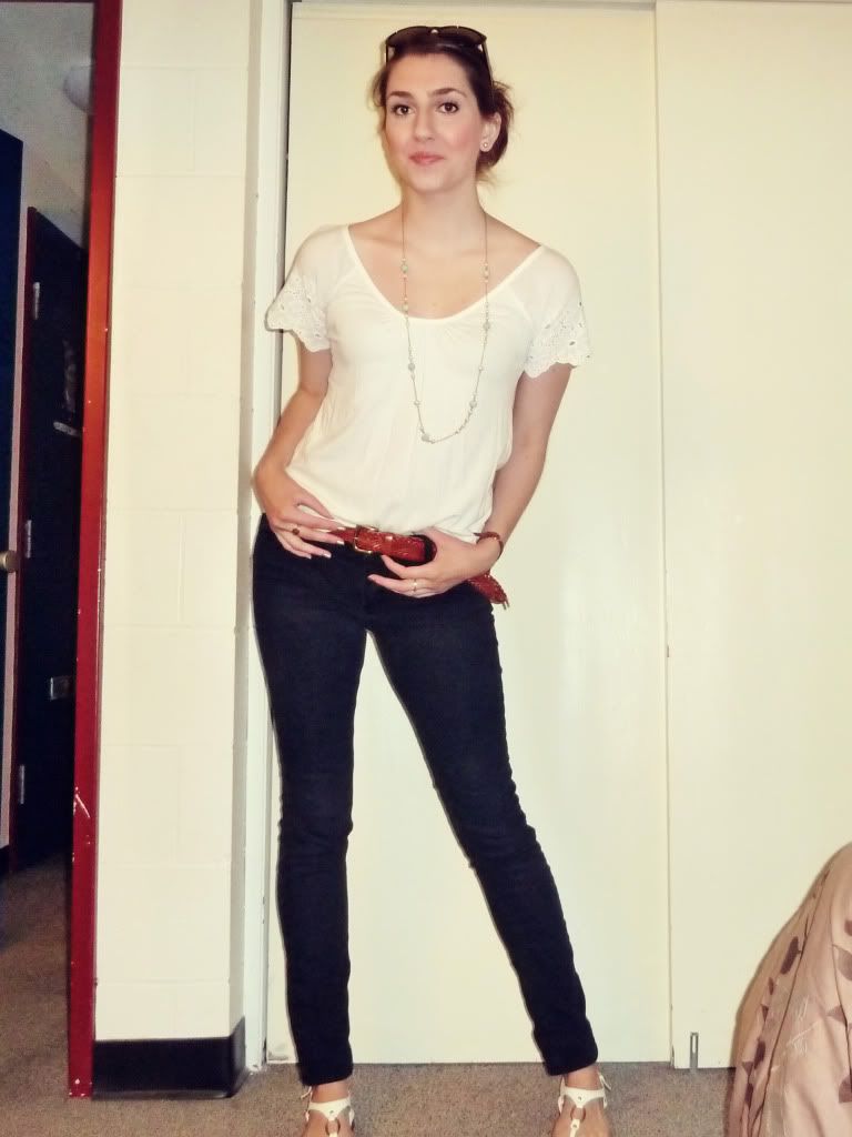 {Cami: Garage, Sweater: Old Navy, Jeans: American Eagle, Belt: Vintage, Shoes: Payless, Ring: RW&Co., Nail Color: OPI Glitzerland}