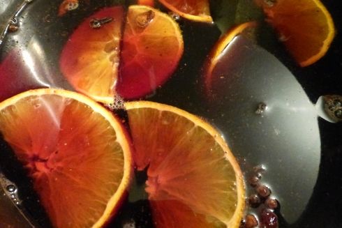 Combine all ingredients in a saucepan, bring to a boil and stir. Boil for 5 minutes, stirring often. Reduce heat and let simmer for 15 minutes, stirring occasionally. Strain using cheesecloth {I kept some of the orange slices to the side before straining and used them in my mug}. Serve warm while writing your holiday cards.